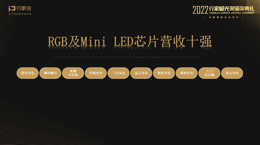 该奖项旨在表彰本年度LED显示产业供应链的优秀龙头企业,在营收、量产或制造等领域起到模范作用的前十名代表。