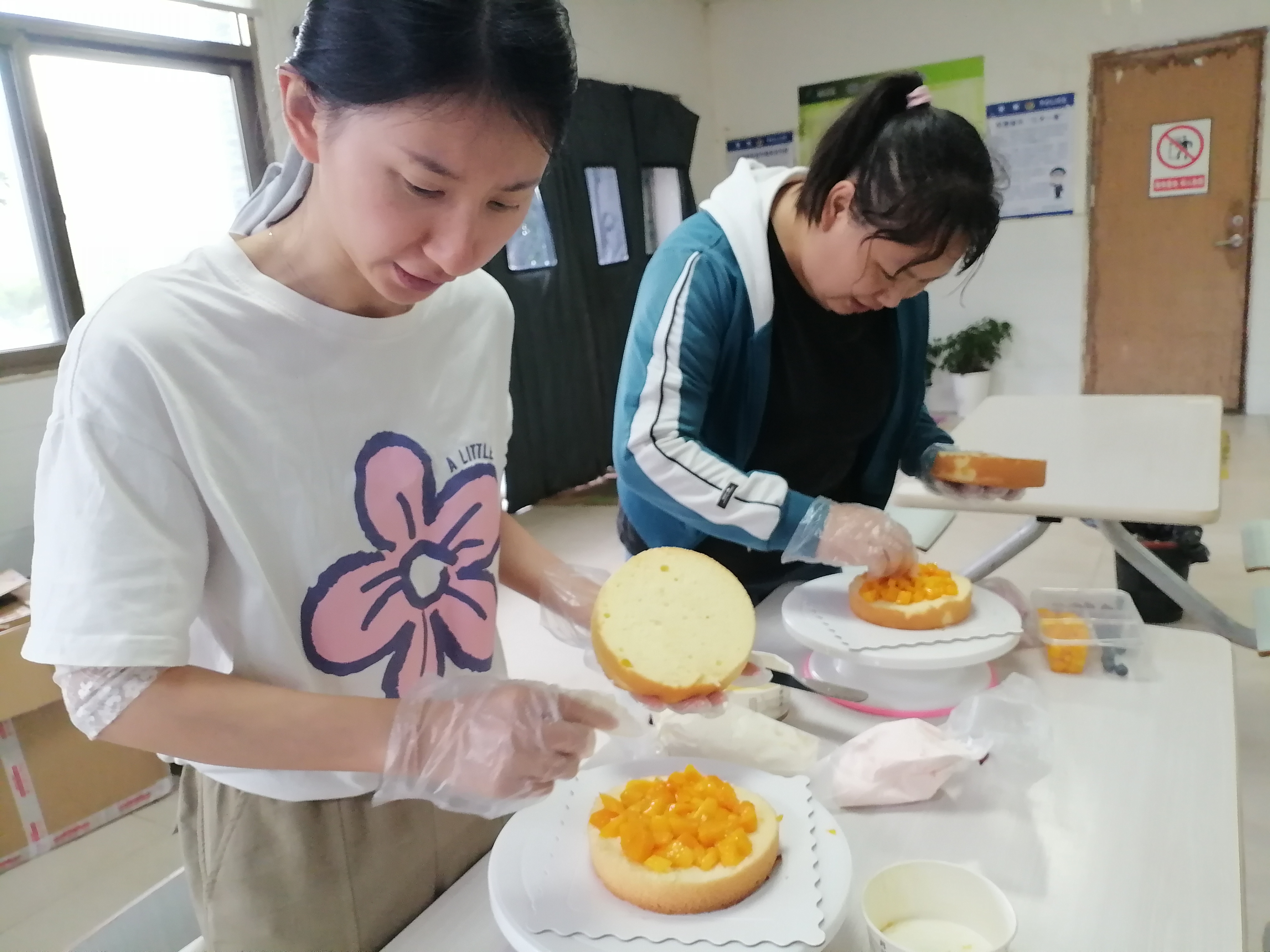 活动现场暖意融融,两位专业蛋糕师傅亲临指导,细致讲解制作流程与技巧,从原料选择、工具使用、抹面手法到造型装饰逐一示范教学。大家认真聆听、用心学习,从涂抹奶油、修整外形,到摆放新鲜水果、设计创意造型,一步步将普通的蛋糕坯变身精致美味的专属蛋糕。