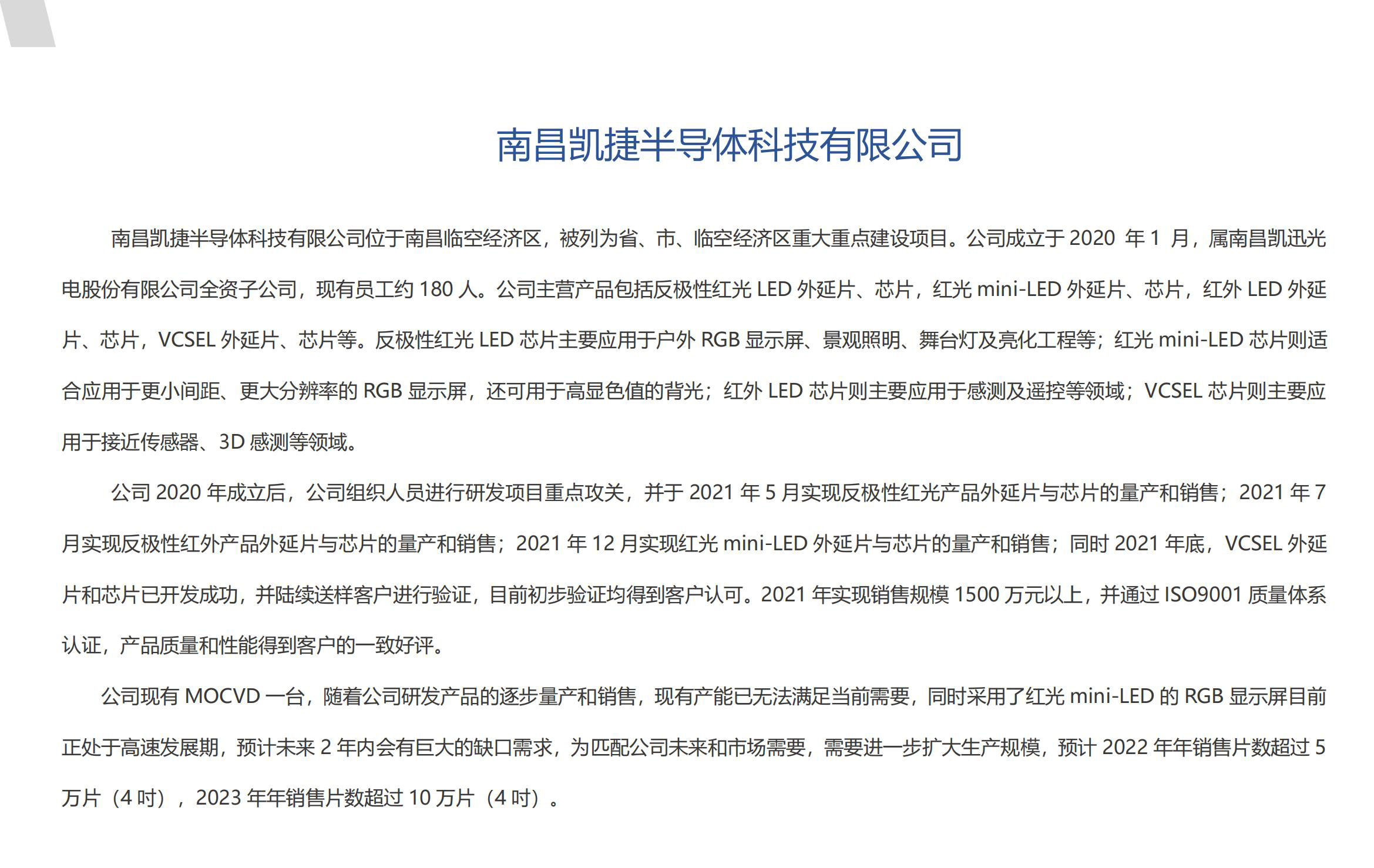 凯迅光电是国家高新技术企业、国家专精特新小巨人“小巨人”企业、国家知识产权优势企业。公司成立于2015年8月,注册资本36,452.075万元,公司位于江西省南昌临空经济区。公司占地约130亩,已建成厂房及设备均可满足公司目前各项生产的需求。随着公司未来业务的增加以及规模的扩大,将继续新建厂房用于新产线建设和生产。